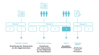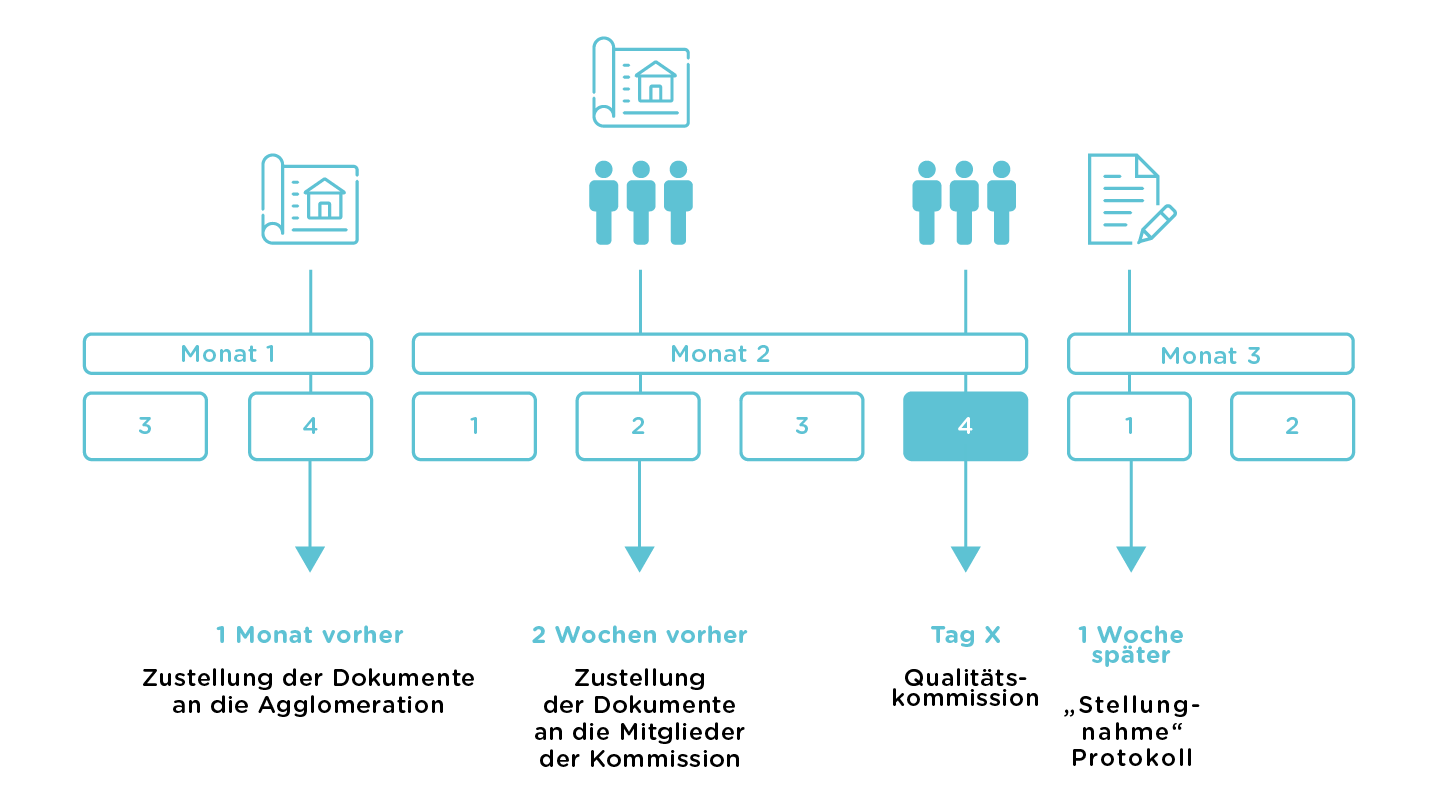 Die Kommission ist verfügbar und tritt auf Wunsch zusammen. Die interessierte Gemeinde legt der Agglomeration die Planungsunterlagen vor, für die sie die Qualitätskommission beiziehen möchte. Die Unterlagen sind je nach Projektfortschritt so vollständig wie möglich zu übermitteln.